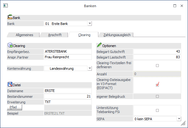 Neben den "normalen" Einstellungen muss das Checkbox "Clearing-Dateiausgabe im V3-Format (EDIFACT) gesetzt sein, da die ausführenden Banken die Clearingdatei für den Auslandszahlungsverkehr nicht einlesen können. (Gilt nur für Österreich - in Deutschland ist ein AZV auch mit dem V2-Format möglich!)