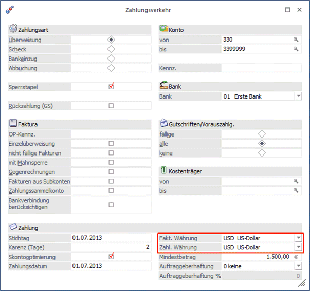 In dem Fenster Zahlungsverkehr kann die entsprechende Zahlwährung ausgewählt werden. Es ist immer nur eine Währung pro Zahlungsstapel möglich.