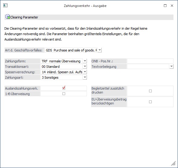 Beim Auslandszahlungsverkehr sollten die Clearing-Parameter entsprechend des zugrundeliegenden Geschäftsvorfalles und der gewünschten Spesenverrechnung eingestellt werden.