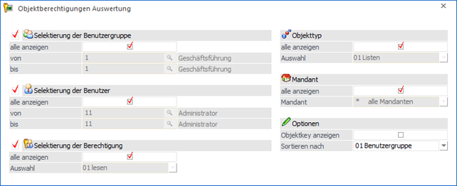 Um Objektberechtigungen gezielt analysieren und auswerten zu können gibt es die "Objektberechtigungen Auswertung" die über