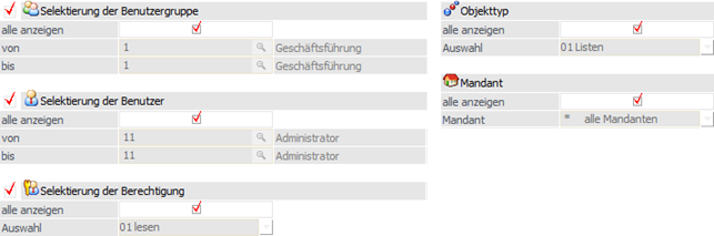 Aktiviert man die Checkbox vor der Überschrift "Selektierung der Berechtigung", dann kann eine Selektion auf die auszuwertenden Berechtigungen vorgenommen werden. Als Selektion stehen folgende Varianten zur Verfügung:
