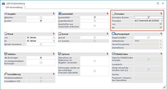 Wird bei der Ausgabe der Umsatzsteuervoranmeldung in einem Mandanten der als Landeskennzeichen "Österreich" hinterlegt hat zusätzlich der Formulardruck aktiviert, so wird standardmäßig der Eintrag "A12 Österreich ab 01/2016" vorgeschlagen.