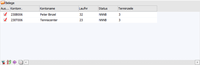 Bei Anwahl dieses Buttons wird ein bestehender Beleg zur Bearbeitung in der Belegerfassung aufgerufen. Wenn in einer Zeile nur eine Kontonummer eingetragen ist, wird beim Druck des Buttons für dieses Konto ein neuer Beleg geladen und die Aktionsplanzeile im Register "Zusatz" mit dem aktuellen Termin vorbesetzt.
