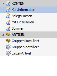 Die Auswertungsmethode beeinflusst die Ausgaben "Ausgabe Bildschirm" und "Ausgabe Drucker". Bei allen anderen Ausgabeformen wird automatisch "Konten - mit Einzelzeilen" bzw. "Artikel - Einzel-Artikel" verwendet, d.h. es werden die Daten unkomprimiert dargestellt.