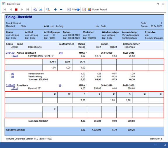 den Informationen der Belegsummen die Artikeleinzelzeilen mit Menge, Wert und
