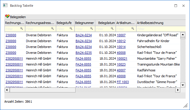 Die Basis der Belegzeilen in der Tabelle bildet immer die Selektion im Backlog. D.h. in der Tabelle kann dieses Datenmaterial nur weiter eingeschränkt werden.