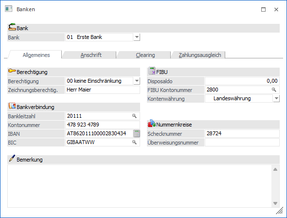 Im Bankenstamm können die Bankinstitute verwaltet werden, mit denen ein elektronischer Zahlungsverkehr durchgeführt wird. Der Bankenstamm ist auch Voraussetzung dafür, dass der Zahlungsverkehr eingesetzt werden kann.