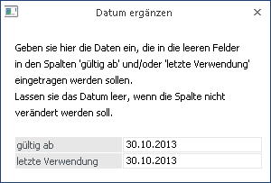 Mit dem Button "Datum ergänzen" wird ein neues Fenster geöffnet, wo es möglich ist für die Felder "gültig ab" und/oder "letzte Verwendung" ein Datum einzutragen. Die Daten werden nur in jene Felder eingetragen bzw. hinterlegt die leer sind.