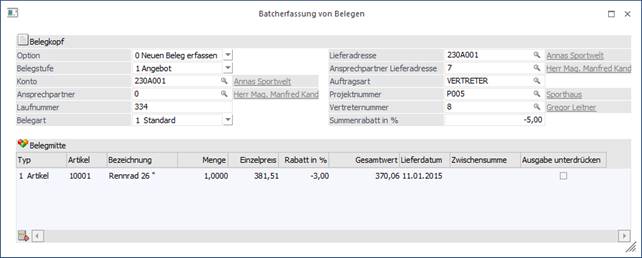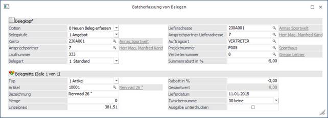 Der Beleg wird im Fenster "Belegerfassung" zur Bearbeitung geöffnet. Das Fenster "Batcherfassung von Belegen bleibt hierbei geöffnet, aber es werden die Eingaben des aktuellen Belegs verworfen.