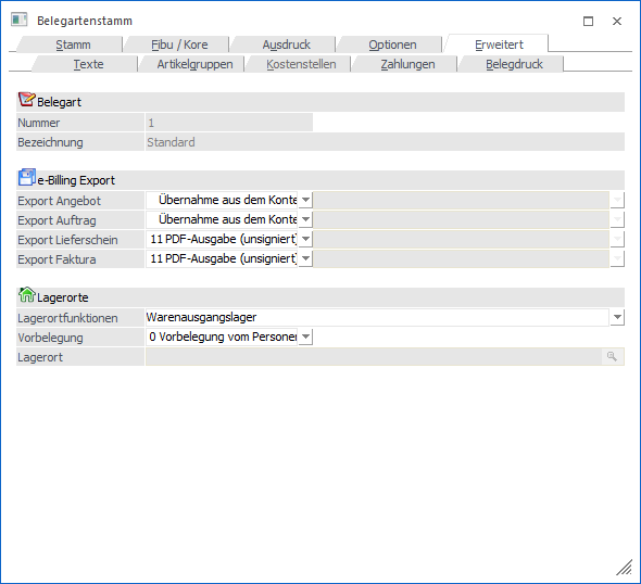 In dem Register "Erweitert" können Einstellungen zu den Themen "e-Billing" und "Lagerorte" getroffen werden.