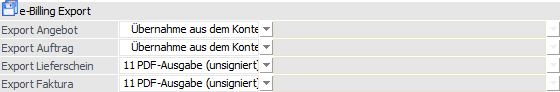 In diesem Bereich kann angegeben werden, wie die Ausgabe von e-Billing-Belege erfolgen soll. Dazu stehen pro Belegstufe die jeweiligen Felder zur Verfügung.
