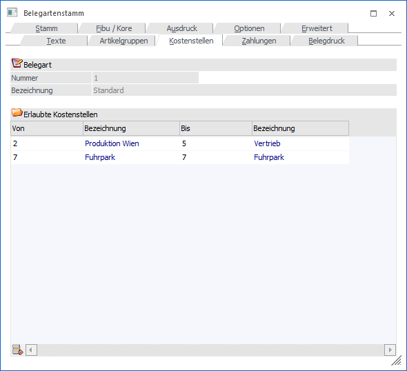 In diesem Register kann definiert werden, mit welche Kostenstellen bei Nutzung der Belegart gearbeitet bearbeitet werden darf.