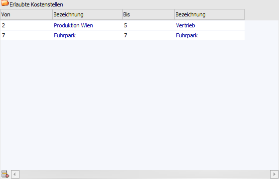 In der Tabelle "Erlaubte Kostenstellen" können Bereiche von Kostenstellen oder einzelne Kostenstellen angegeben werden, welche innerhalb der Belegerfassung genutzt werden dürfen. Wurde keine Eingabe getroffen, so liegt auch keine Einschränkung vor.