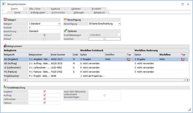 In dem Register "Stamm" werden die grundsätzlichen Einstellungen einer Belegart (Einkauf / Verkauf, Belegnummer, etc.) getroffen.