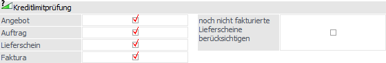 Im Personenkontenstamm kann pro Konto ein Warn- bzw. Sperrbetrag hinterlegt werden. In welchen Belegstufen dieser Warn- bzw. Sperrbetrag geprüft werden soll, kann an dieser Stelle durch Setzen der Häkchen eingestellt werden. Damit ist es z.B. möglich, auch bei der Sperre eines Kunden "Angebote" oder "Barfakturen" zu erfassen.