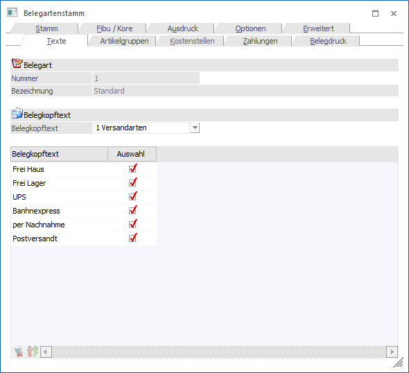 In dem Register "Texte" können Belegkopftexte einzelnen Belegarten zugeordnet.