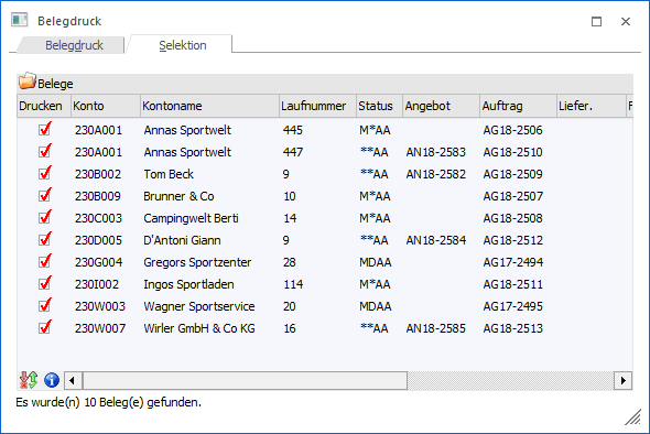 Nachdem im Register "Belegdruck" die Vorselektion durchgeführt wurde, werden bei dem Wechsel in das Register "Selektion" automatisch alle Belege aufgelistet, welche den Selektionskriterien entsprechen. Ob eine Beleg gedruckt / umgewandelt werden soll oder nicht kann mit Hilfe der Tabelle "Belege" manuell entschieden werden.