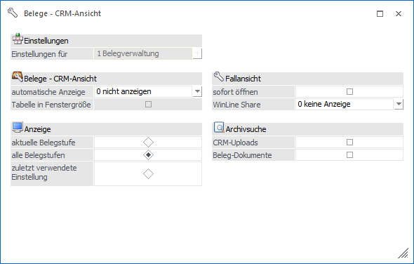 Durch Anwahl des Buttons "Einstellungen" im Programm "Belege - CRM-Ansicht" stehen diverse Optionen bzw. Einstellungen zur Verfügung.