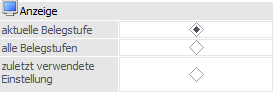 Hier kann festgelegt werden, ob bei dem Start des Fensters der Radiobutton für "Anzeige" fix auf "aktuelle Belegstufe" oder fix auf "alle Belegstufen" gesetzt werden soll bzw. ob die zuletzt verwendete Einstellung gelten soll.