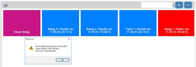 Wenn ein anderer Benutzer gerade einen Beleg bearbeitet, wird dieser Beleg als rote Kachel bei den geparkten Belegen dargestellt. In der Zeit der Bearbeitung kann kein anderer Benutzer diesen Beleg aufrufen, versucht man jedoch diesen Beleg aufzurufen, wird eine Meldung angezeigt, dass dieser Beleg gerade in Bearbeitung ist.