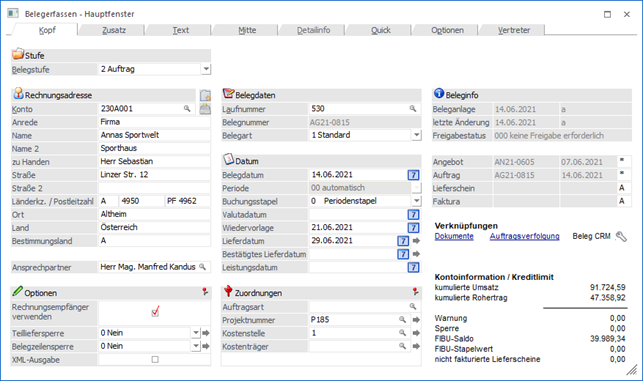 "Kopf" können neue Belege erstellt, editiert oder umgewandelt werden.