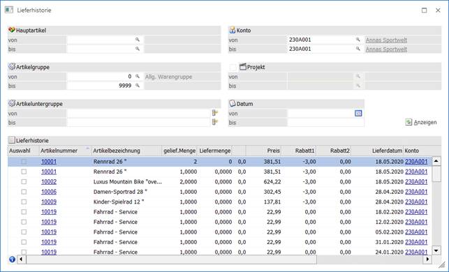 ü Neben der Anzeige der Artikelnummer, dem damaligen Preis, Rabatt, dem Lieferdatum und der Laufnummer des Beleges wird vor allem aber auch die Menge angezeigt (Spalte "gelief. Menge"), die damals geliefert wurde.