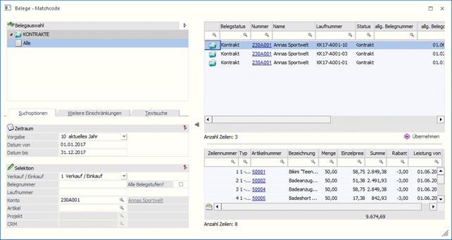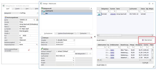 Mittels Matchcode (Beleg Match) kann nach bestehenden Kontrakten gesucht werden.