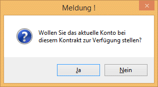 Wenn dieser Button gedrückt wird, wird das gerade im Kontrakte abbuchen geladene Konto beibehalten und der angewählte Kontrakt geladen. Falls das aktuelle Konto noch nicht in der Liste der zugelassenen Konten vorhanden ist (also dem Kontrakt noch nicht zugeordnet ist), wird diese dynamisch erweitert. Dazu muss die zugehörige Meldung entsprechend bestätigt werden: