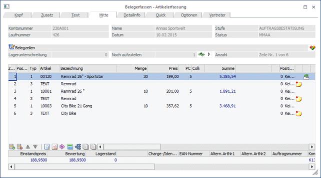In der Erfassungstabelle können die gewünschten Mengen der Artikel nach Bedarf verändert werden. Nicht möglich ist es jedoch, neue Artikelzeilen, bzw. Zeilen des Typs "2-Makro" hinzuzufügen (ein Entfernen von Zeilen ist jedoch möglich).