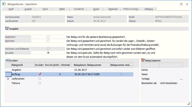 In weiterer Folge kann der Beleg - gleich wie im Belegerfassen - gespeichert, gerechnet oder gedruckt werden.
