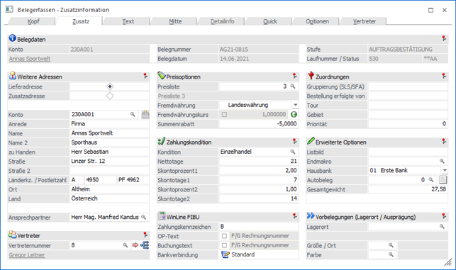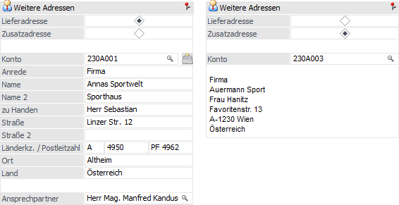 Standardmäßig erfolgt die Vorbesetzung dieser beiden Felder mit den Werten der Lieferadresse (unabhängig davon, welches Konto als Hauptkonto definiert ist)!