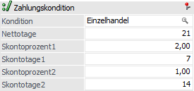 An dieser Stelle kann eine zuvor definierte Zahlungskondition für den Beleg gewählt werden, wobei eine Vorbesetzung aufgrund des Personenkontos stattfindet. Durch die Auswahl einer Kondition werden die Felder "Nettotage", "Skontoprozent 1", "Skontotage 1", "Skontoprozent 2" und "Skontotage 2" automatisch befüllt, können aber trotzdem manuell editiert werden. Eine Auswahl von inaktiven Zahlungskonditionen ist nicht möglich.