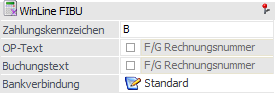 Hier wird das Zahlungskennzeichen, welches im Personenkontenstamm (Register "FIBU") hinterlegt wurde, angezeigt und kann manuell verändert werden. Das Zahlungskennzeichen wird automatisch in die WinLine FIBU übergeben und dient dort zur Selektion im Zahlungsverkehr (Bereich "Selektion - Fakturen" - Feld "OP-Kennz.").