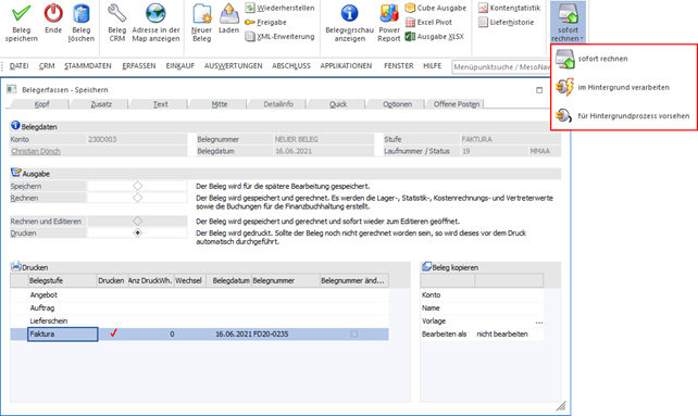 Im Bereich "Speichern" der Belegerfassung (ohne und mit individueller Vorlage) bzw. im Menüpunkt "Barrechnungen" gibt es den Auswahlbutton "sofort rechnen". Wenn dieser angewählt wird, können verschiedene Optionen gewählt werden, was mit dem Beleg beim Belegdruck passieren soll.