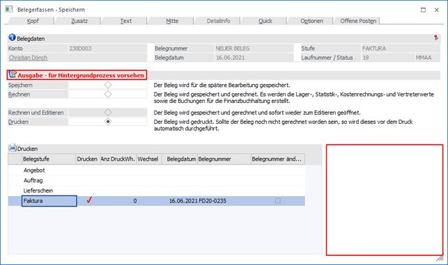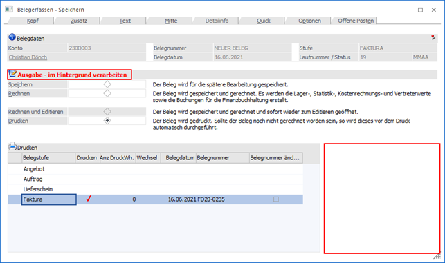Wenn ein Beleg nicht direkt gedruckt werden soll, kann dieser für einen nachträglichen Hintergrunddruck vorgesehen werden. Belege, welche mit dieser Option "gedruckt" werden, werden im eigenen Menüpunkt Hintergrundprozesse abgestellt und können zu einem späteren Zeitpunkt gedruckt werden. Die Belegerfassung ist damit sofort wieder zur weiteren Bearbeitung freigegeben.