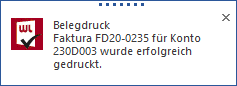 Die Belegerfassung ist damit sofort wieder zur Bearbeitung freigegeben. Wenn der Beleg anschließend fertig gedruckt wurde, erscheint wiederum eine dementsprechende Meldung: