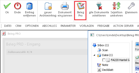Alle zuvor eingetragenen Werte im Menüpunkt "neuer Archiveintrag" werden bei der Anwahl des Buttons "Beleg Pro" verworfen. Somit hat dieser Menüpunkt bzw. die dort eingetragenen Werte grundsätzlich keine Relevanz für den Belegeingang über das Modul "Beleg PRO"