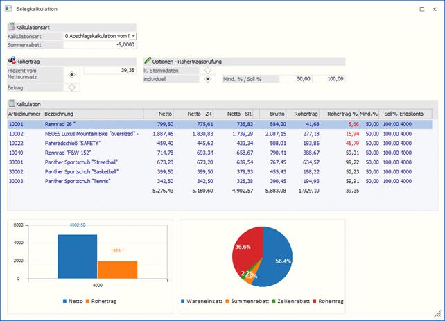 Bei jeder Neueingabe eines Artikels, Änderung der Artikelmenge oder des Artikelpreises oder wenn eine Artikelzeile aus der Belegmitte entfernt wird, wird das Fenster "Belegkalkulation" aktualisiert.