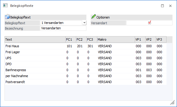 In der Tabelle werden die Auswahlen für die Belegkopftexte hinterlegt.