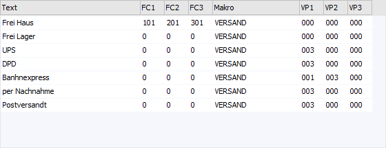 In der Spalte "Makro" kann pro Auswahl ein Makro eingegeben werden. Dieses Makro wird zusätzlich zum Belegendmakro im Beleg verwendet, wenn der entsprechende Belegkopftext ausgewählt wird (Register "Text" in der Belegerfassung)