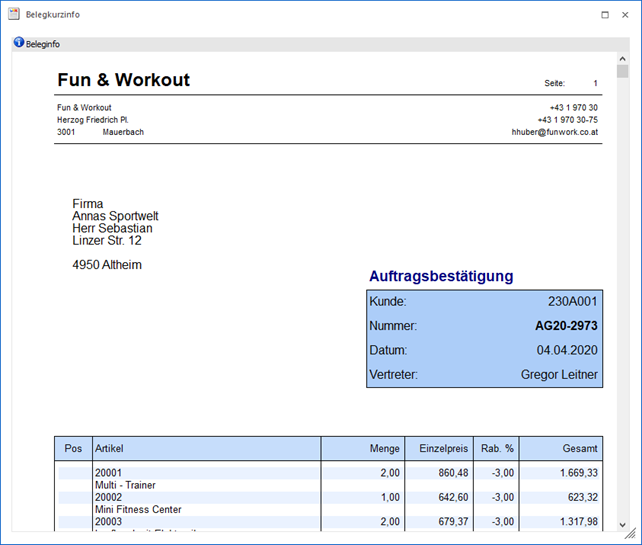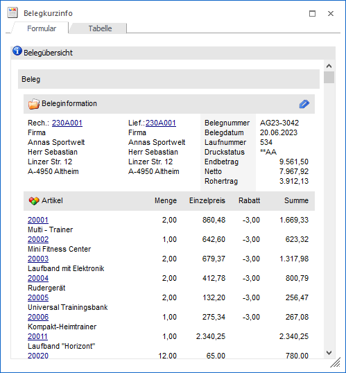 In der Darstellungsform "Beleginfo" des Registers "Formular" wird der Beleg als solches angezeigt.