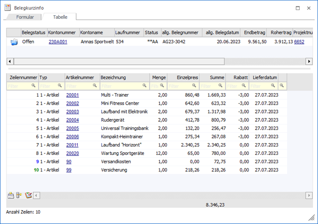 "Belegmitte" werden die Belegzeilen des Belegs angezeigt. Folgende Punkte sind