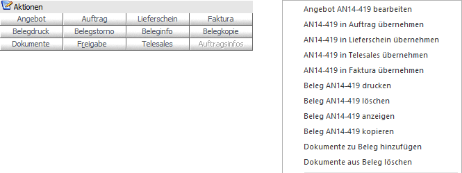 Das Bearbeiten bzw. die Neuanlage von Belege findet entweder über die Buttons im Bereich "Aktionen" oder über die rechte Maustaste statt. Hierbei sind die Bearbeitungsmöglichkeiten immer abhängig vom Beleg, welcher gerade im Fokus liegt.