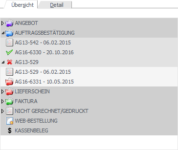 Im Unterregister "Übersicht" werden die Belege (pro Konto) in Form einer Baumstruktur dargestellt. Hierbei wird mit Hilfe von Icons auf den jeweiligen Status des Belegs hingewiesen.