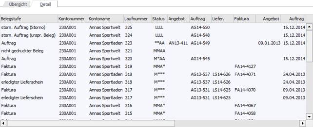 Im Unterregister "Detail" werden die Belege in Form einer Tabelle dargestellt. Hierbei stehen im Gegensatz zur Baumstruktur zusätzliche Informationen zur Verfügung, welche über die Funktion "Spalten anzeigen / verstecken" (rechte Maustaste) verändert werden können.