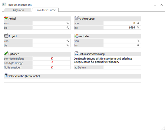 Da es nicht immer gewünscht ist alle Belege aus allen Wirtschaftsjahren zu sehen (z.B. aus Gründen der Übersichtlichkeit) kann hier ein Datum eingetragen werden, ab dem auch die stornierten Belege (jene Belege mit den Belegstati LLLL), die erledigten Belege (z.B. jene Belege mit den Belegstati ----) und die gedruckten Fakturen angezeigt werden sollen.
