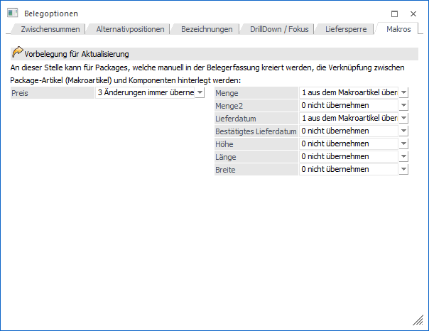 Um nachfolgende Artikel diesem Package zuordnen zu können, kann in diesem Register eingestellt werden, wie sich die Artikel / Makro verhalten soll (normalerweise wird diese Einstellung im Makro selbst getroffen).