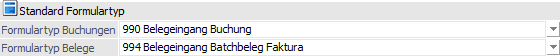 Der Standard-Formulartyp der WinLine für Belege ist der Formulartyp "994 - Belegeingang Batchbeleg Faktura" und wird normalerweise dementsprechend beim Eingang vorbelegt. Wenn ein anderer Formulartyp gewünscht ist, kann dieser hier eingetragen werden. Angezeigt werden nur Formulartypen mit der Kategorie "4 - Belegeingang Belege".