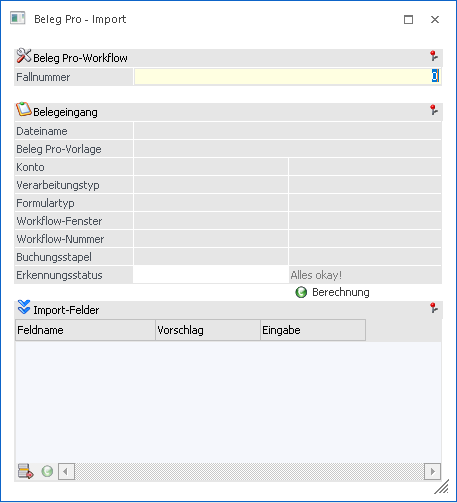 Wenn das Fenster "Beleg Pro - Import" direkt aus dem "Beleg Pro - Wizard" geöffnet wurde, wird die Fallnummer bereits automatisch übergeben und kann nicht manuell angepasst bzw. eingegeben werden.