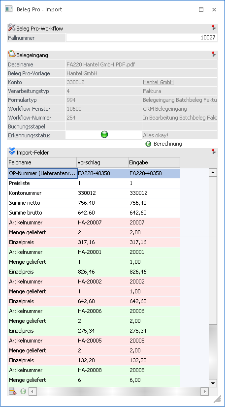 Wenn zuvor bereits der Folgeschritt mittels Button "Delegation für Prüfung" geschrieben wurde, kann die Buchung an den Stapel übergeben oder der Beleg in der Fakturierung gedruckt werden. Falls es hier einen Fehler geben sollte, dann ist dieser im "Erkennungsstatus" ersichtlich. (z.B: kein "KontoSoll" eingetragen bzw. "Artikel existiert nicht")